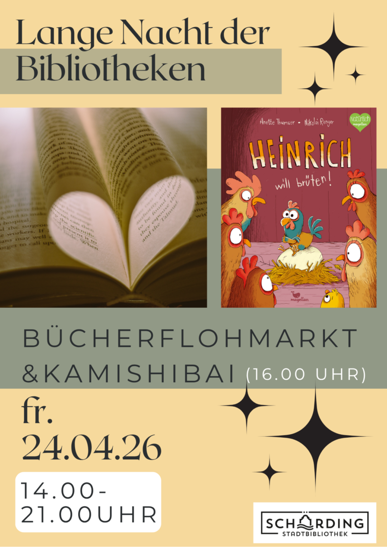 Am 24.04.2026 öffnet unsere Stadtbibliothek bis um 21 Uhr die Tür zur langen Nacht der Bibliotheken. Geboten wird ein Bücherflohmarkt, sowie um 16:00 Uhr ein