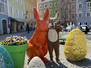 Der Osterhase ist in der Schärdinger Innenstadt unterwegs und mit im Gepäck hat der