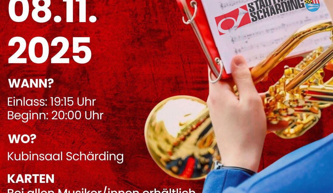 Zurück zur Übersicht Herbstkonzert 08.11.2025 Uhrzeit: 20:00 UhrOrt: KubinsaalVeranstalter: Stadtkapelle Schärding Einladung zum Herbstkonzert der Stadtkapelle Schärding Samstag | 8. November 2025Kubinsaal Schärding Einlass: 19.15 UhrBeginn: 20 Uhr Vorverkauf: 10 €Abendkassa: 12 €Bei allen Musiker/innen erhältlich. www.stadtkapelle-schaerding.at Aktuelle Termine Stammtisch Schärdinger Goldhaubenfrauen 05.11.2025 Uhrzeit: 19:00 UhrOrt: Lachinger's Kitchen & WineVeranstalter: Goldhaubengruppe Schärding Wochenmärkte 06.11.2025 Uhrzeit: 07:00 UhrOrt: Schärding Stadtplatz Alle Termine